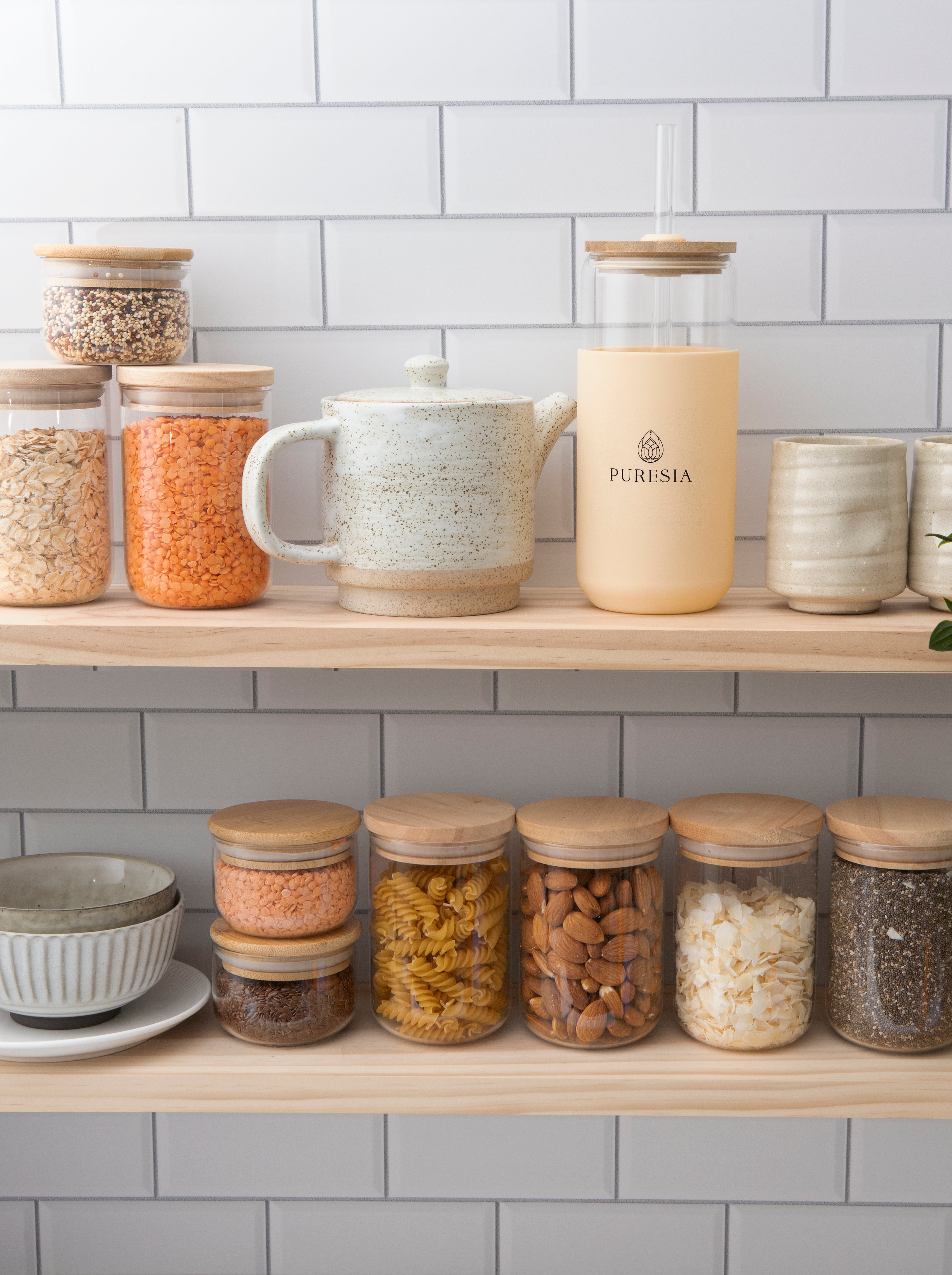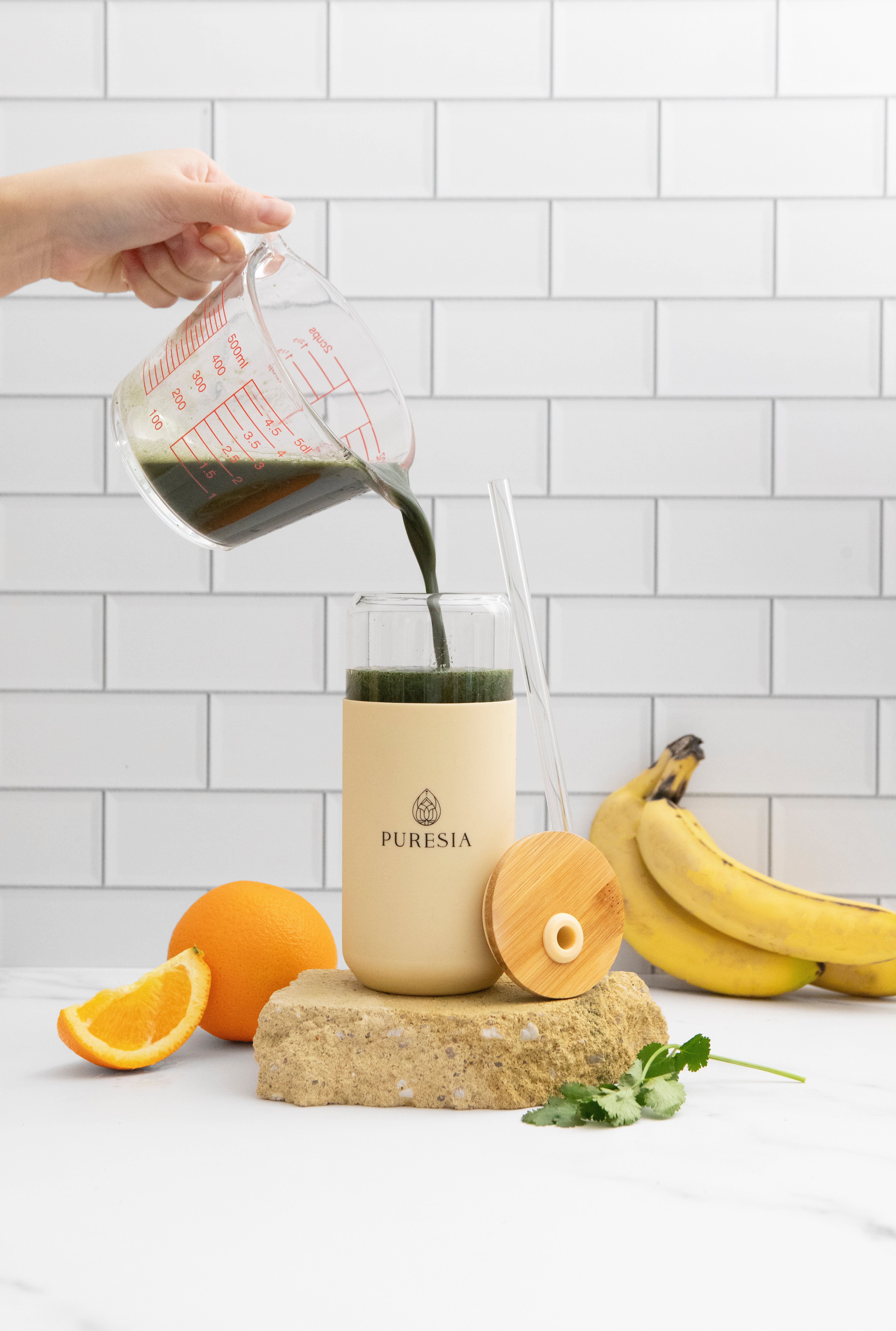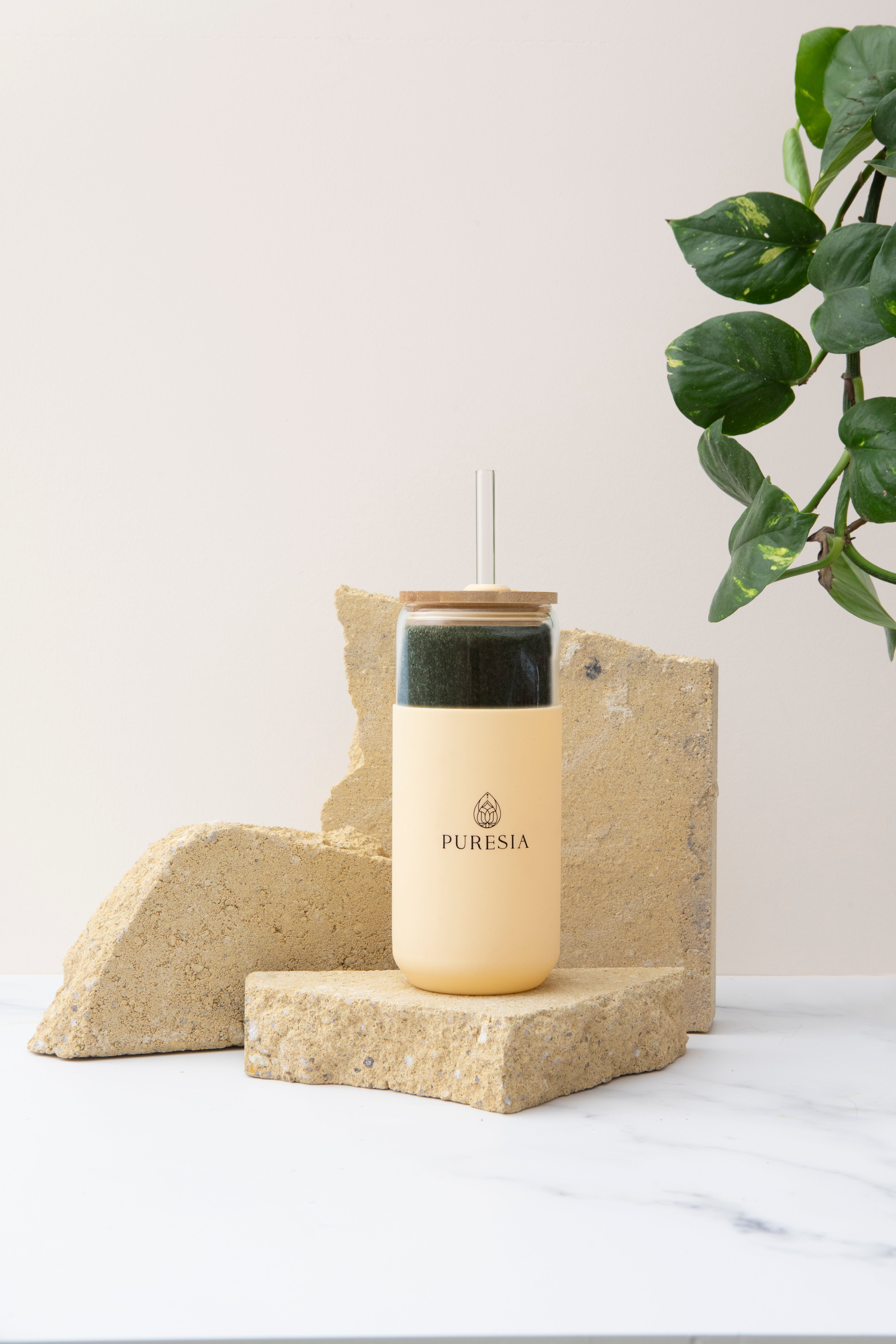 Sip in style with our Puresia Glass Smoothie Cup. Made from borosilicate glass with a protective sleeve, an airtight bamboo lid, and choice between a glass or stainless steel straw.